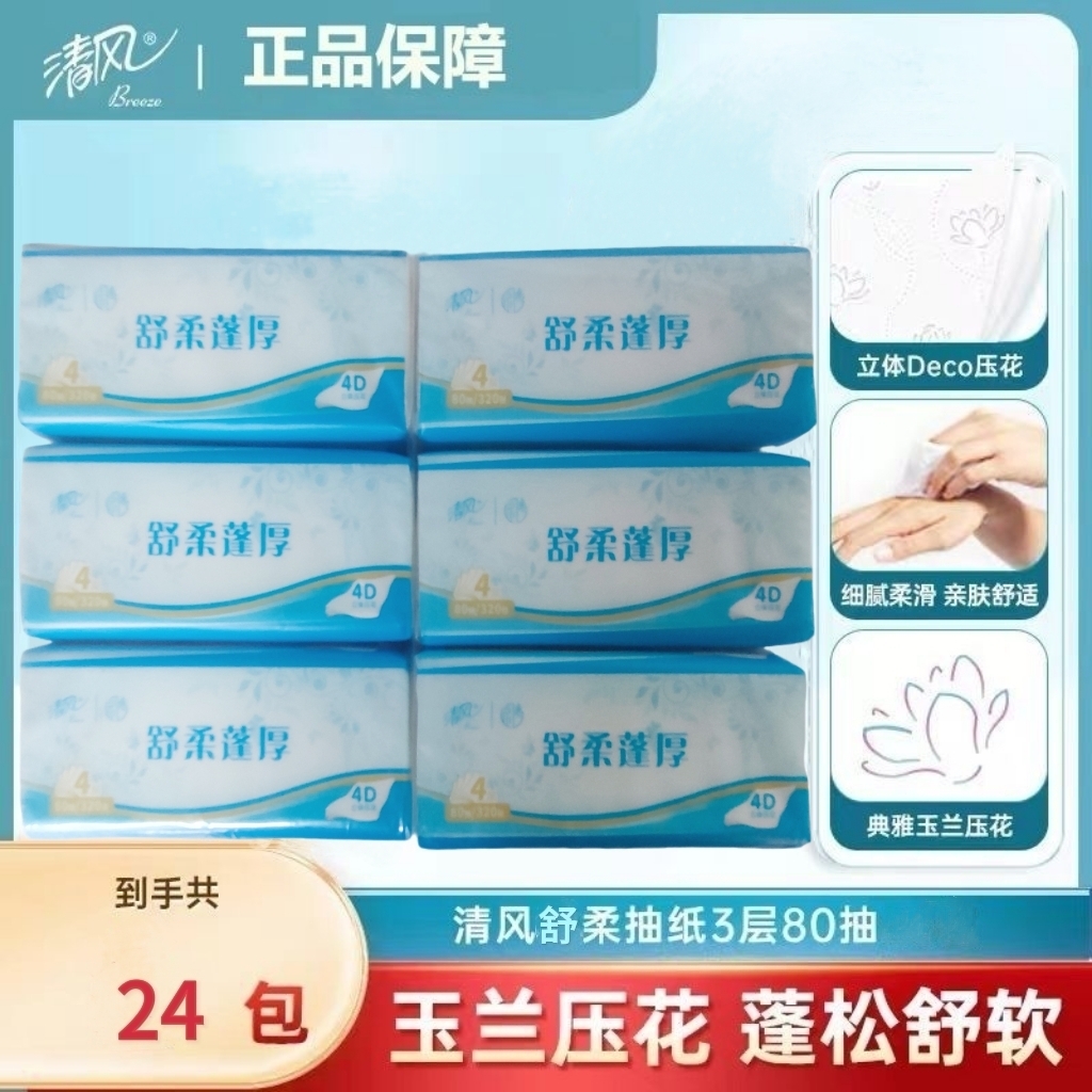 清风舒柔蓬厚4层80抽4D立体印花抽取式面巾纸 AR30SHS 24包/箱
