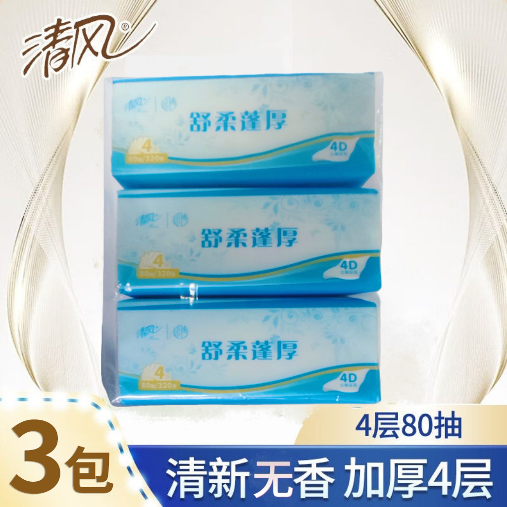 清风舒柔蓬厚4层80抽4D立体印花抽取式面巾纸 AR30SHS 3包/提